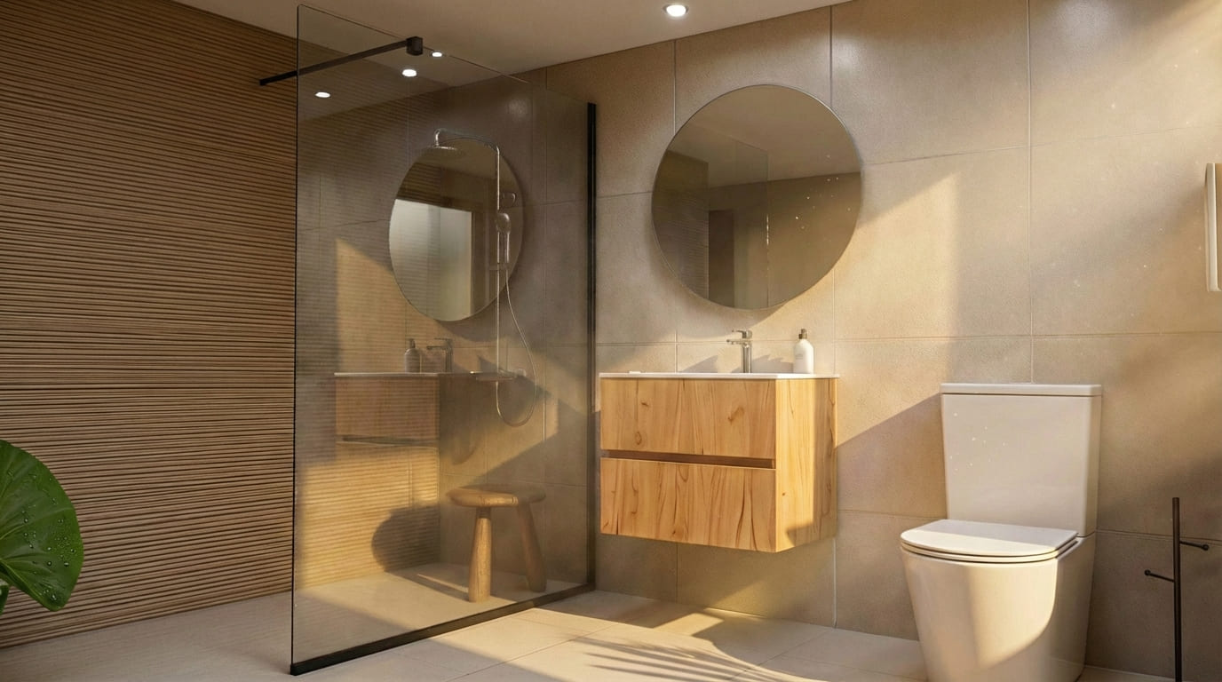 El baño esta compuesto por material cerámico de primera calidad. Hay una superficie mínima de pedido y se deberá personalizar según la necesidad. Incluye inodoro, mueble, espejo, grifería, plato de ducha y la posibilidad de mampara. Recomendamos dejar un paso mínimo de 50 cm y un fijo mínimo de 90.